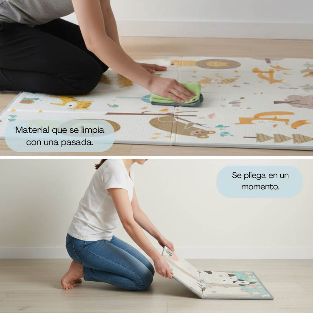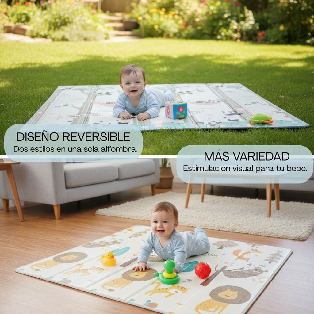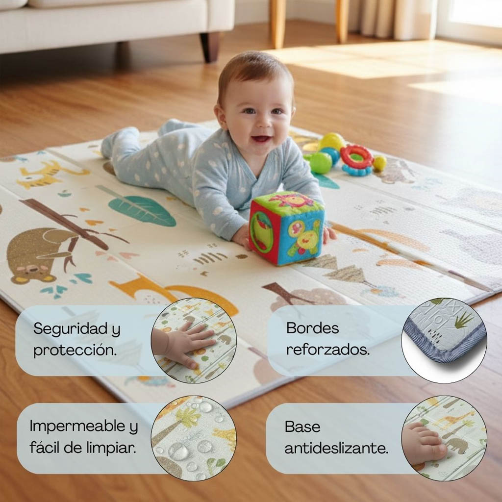Alfombra para bebé diseñada para crear un espacio perfecto de juego y aprendizaje para tu pequeño. Con dimensiones generosas de 200 x 150 cm y un acolchado de 1 cm, proporciona una superficie suave y protectora ideal para los primeros movimientos de tu bebé. Su diseño reversible combina encantadoras ilustraciones infantiles por un lado y elementos educativos por el otro que estimulan el desarrollo cognitivo temprano. La practicidad se une al confort con su característica plegable, permitiéndote transportarla o guardarla con facilidad cuando no esté en uso. Fabricada con materiales impermeables y resistentes, la limpieza es rápida y sencilla, manteniéndola siempre lista para las aventuras diarias de tu bebé.