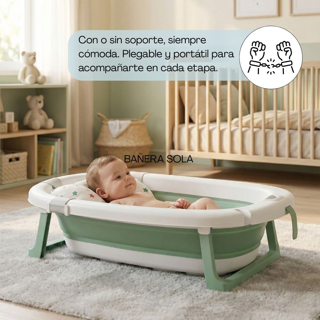 Descubre la máxima comodidad y funcionalidad con nuestra bañera para bebés plegable que incluye soporte, más cojín reductor. Un todo en 1 para que no te falte de nada. Diseñada pensando en la practicidad y el cuidado de tu pequeño, esta bañera incluye: