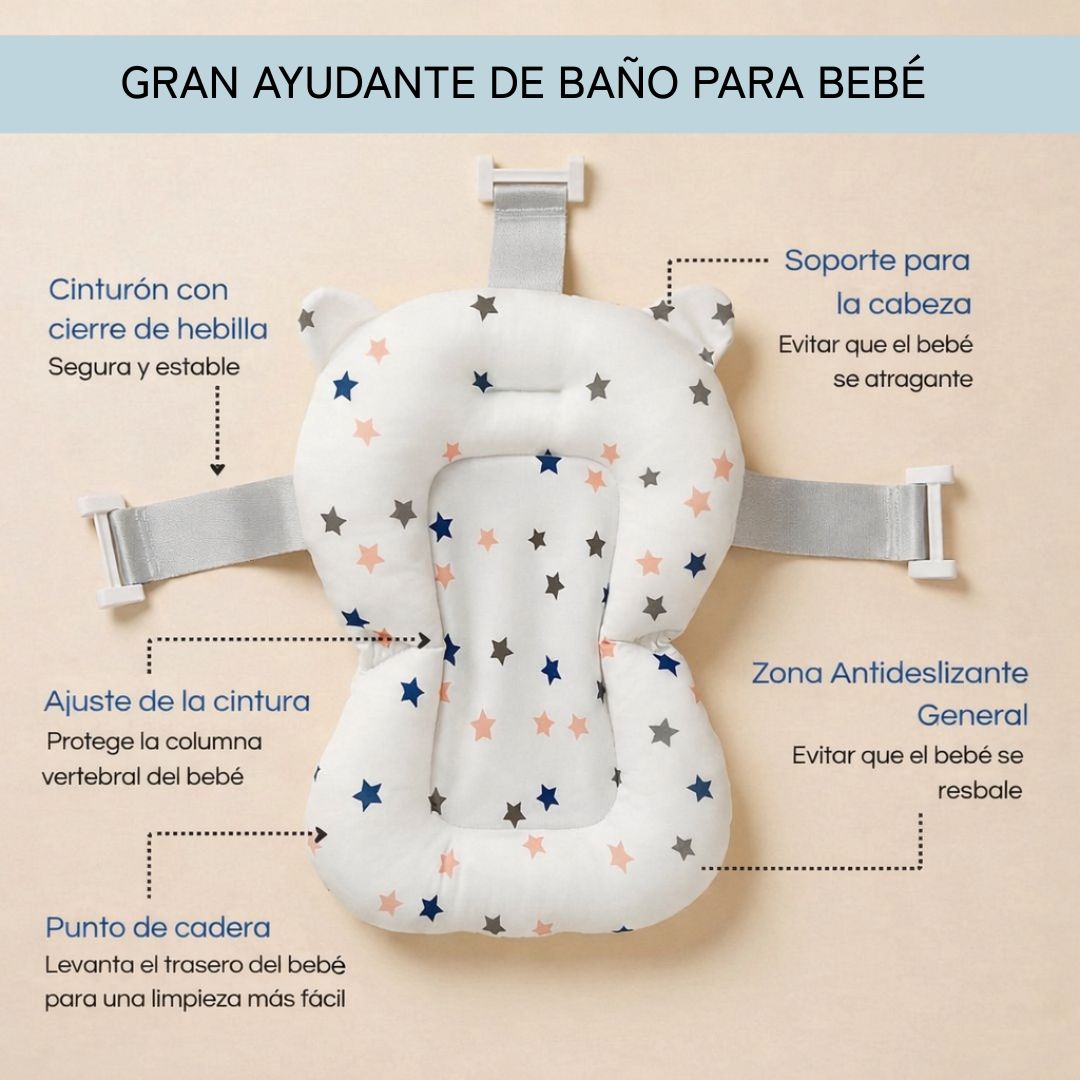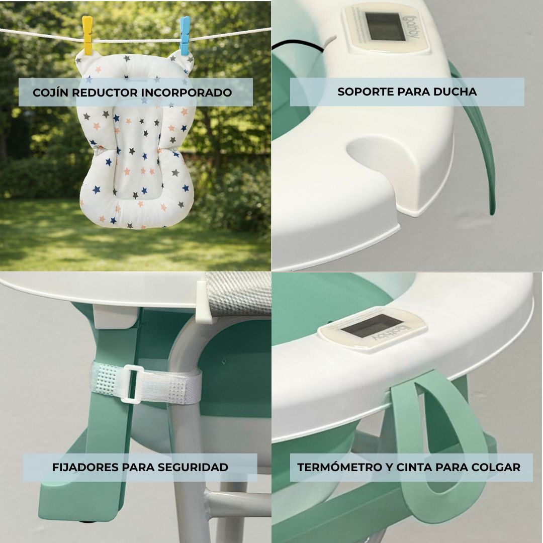 - Comodidad y seguridad en cada uso: patas antideslizantes, bordes suaves y un cojín reductor ergonómico mantienen al bebé en una posición cómoda y estable durante el baño.
