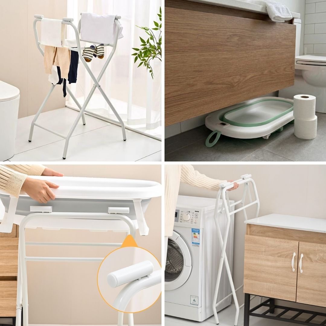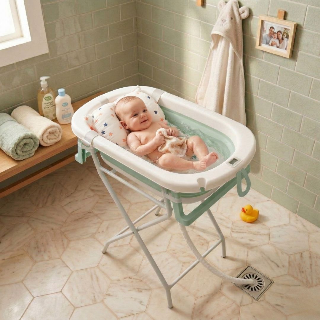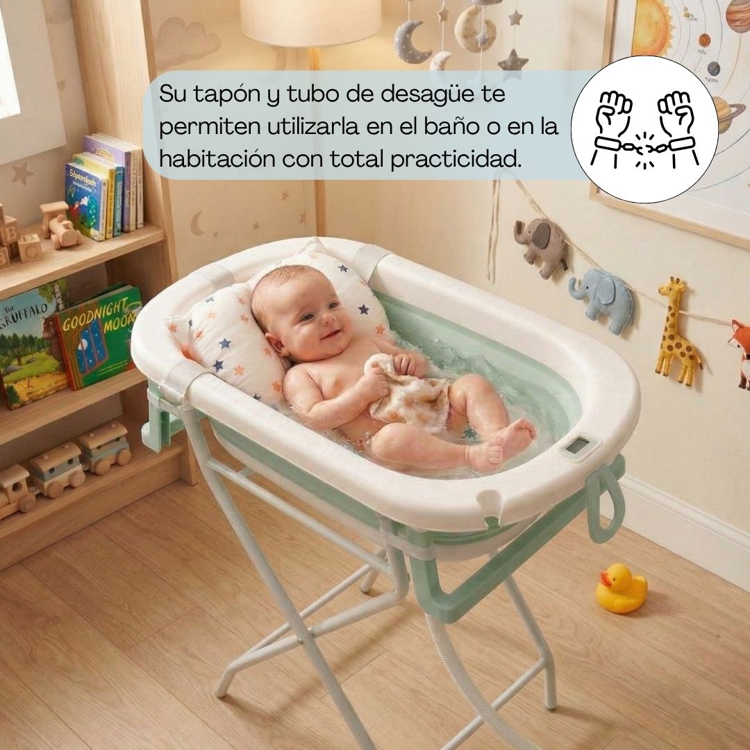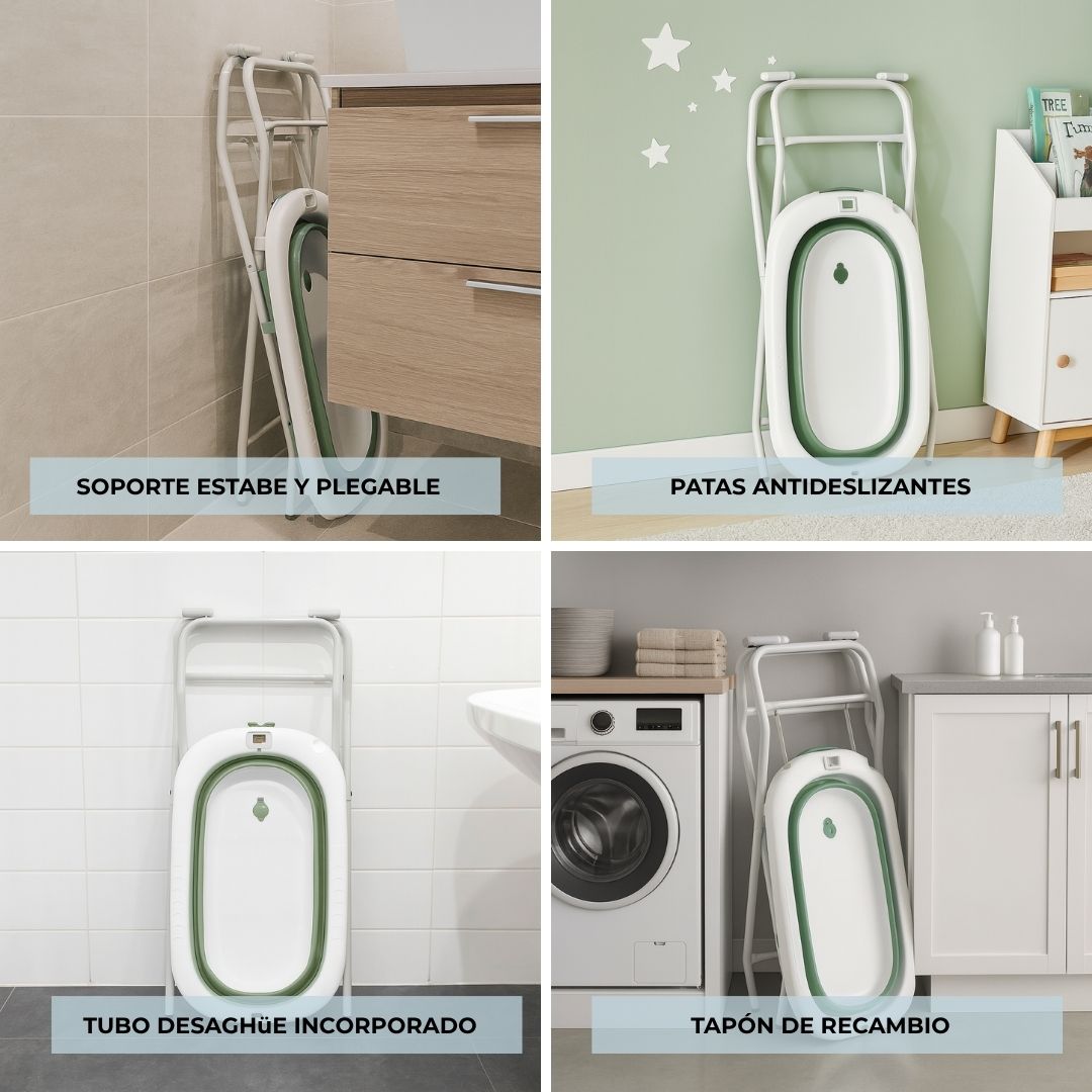 - Altura ergonómica y fácil transporte: el soporte eleva la bañera a una altura ideal para evitar agacharse, cuidando la espalda de los padres. Su diseño ligero permite moverla cómodamente de una habitación a otra o llevarla de viaje.