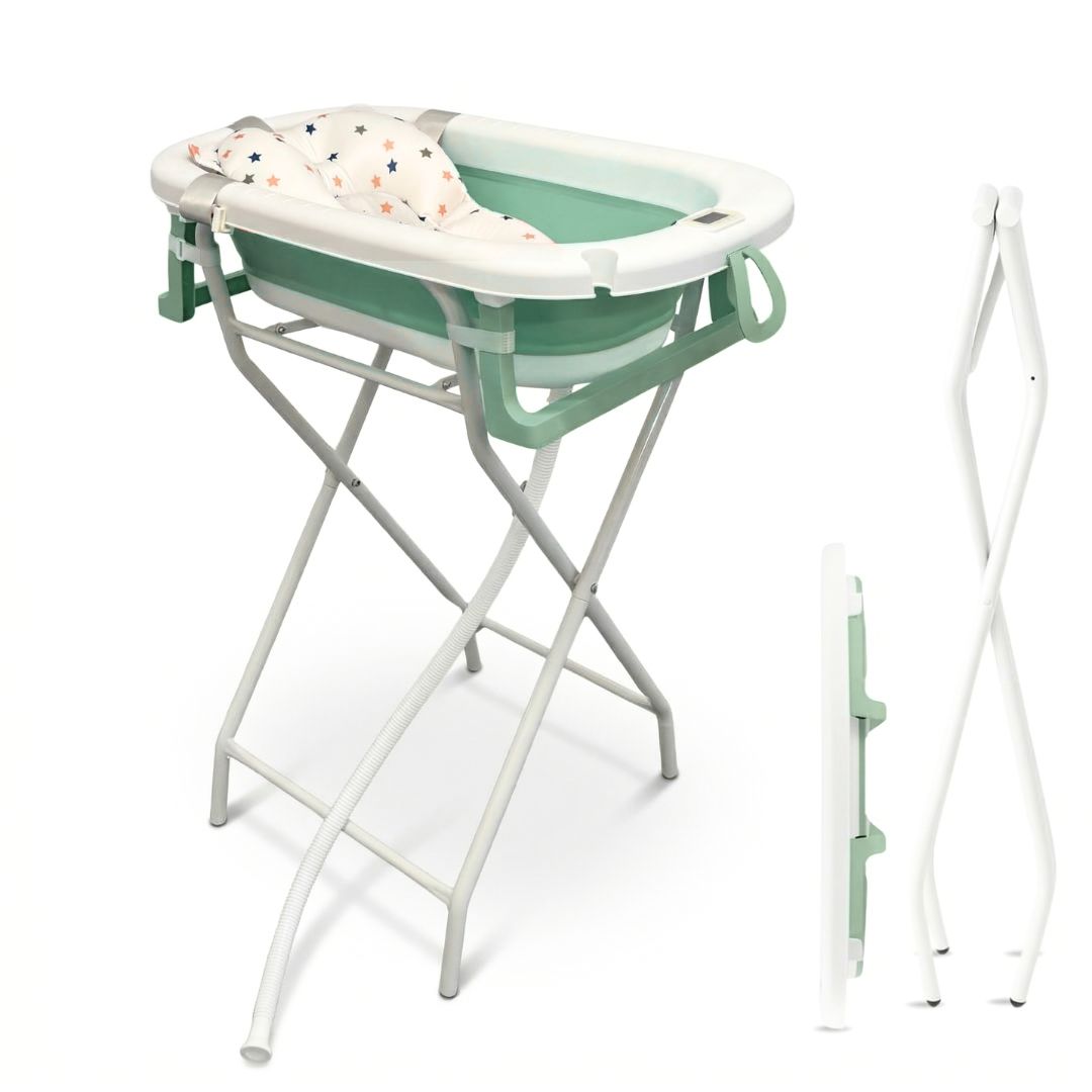 Bañera de bebé plegable con soporte + cojín reductor, en color blanco y verde. Combina comodidad, seguridad y practicidad para que el momento del baño sea más fácil y agradable tanto para el bebé como para los padres. Su diseño ergonómico y funcional incluye todos los elementos necesarios: bañera plegable, soporte estable, cojín reductor, tubo de desagüe y tapón de recambio. Fabricada con materiales de alta calidad y libres de BPA, ofrece la máxima seguridad, durabilidad y confort, tanto en casa como durante los viajes.
