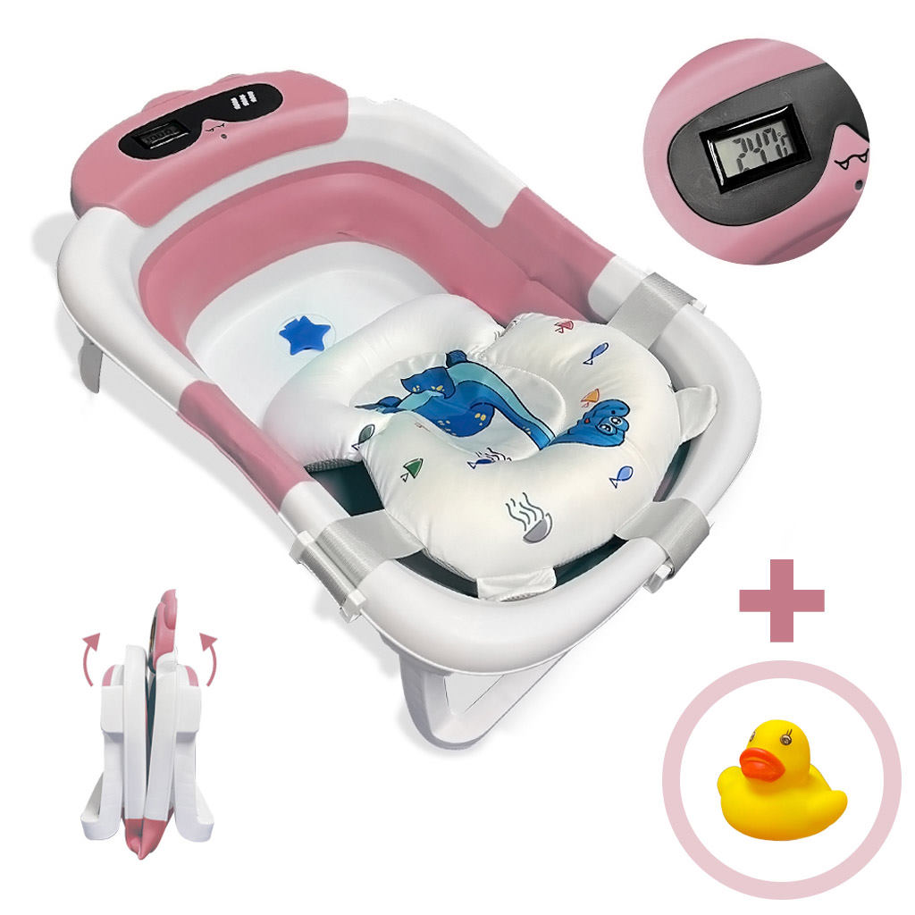 Bañera bebé plegable EXPLORER con termómetro y cojín reductor, modelo dinosaurio color rosa