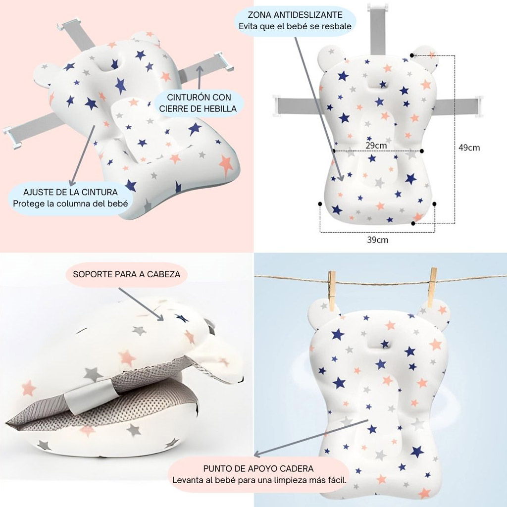 • Cojín reductor de apoyo suave: incluye un cojín ergonómico que proporciona un soporte adicional, asegurando que tu bebé esté cómodo y seguro durante el baño. Este cojín es extraíble para una limpieza fácil y rápida.