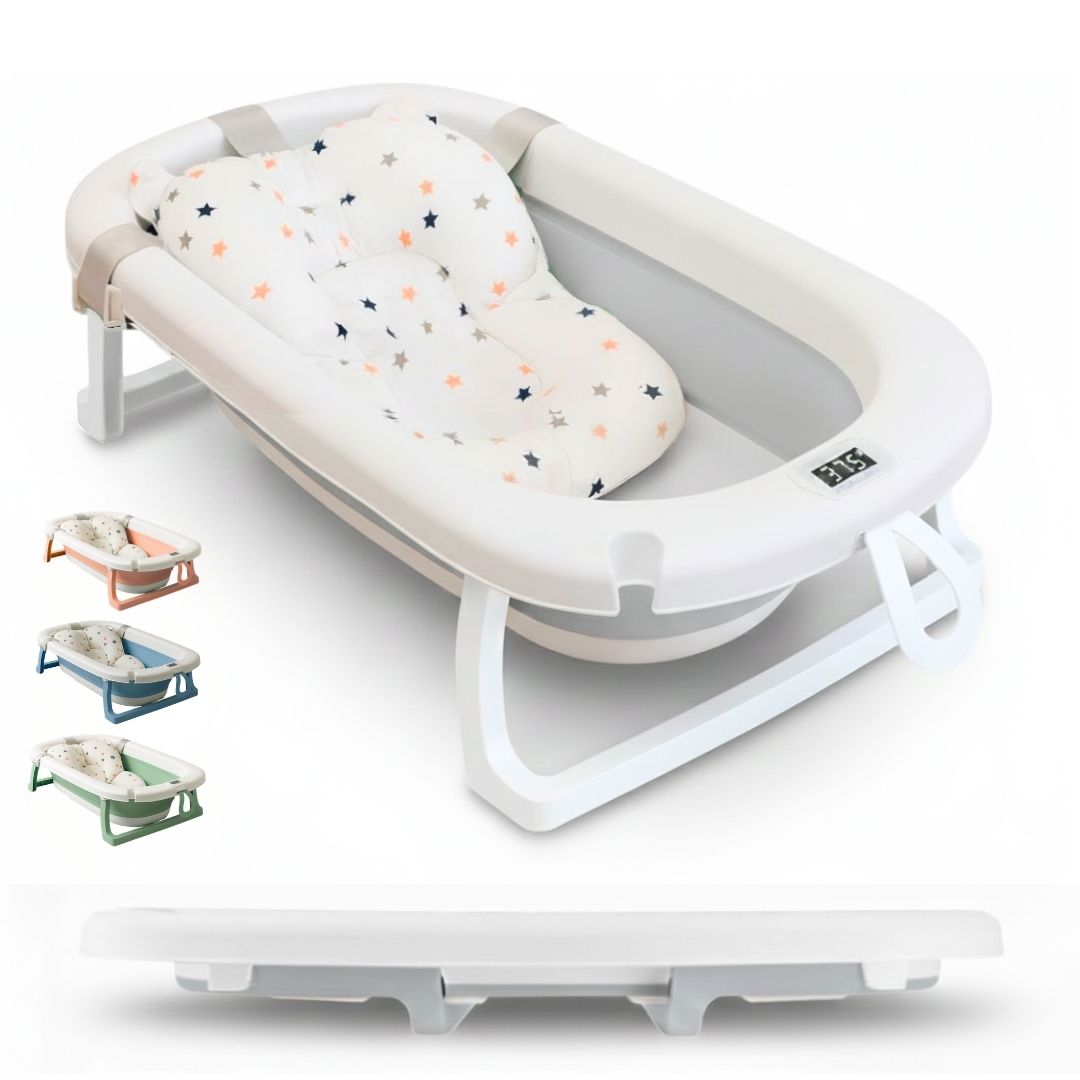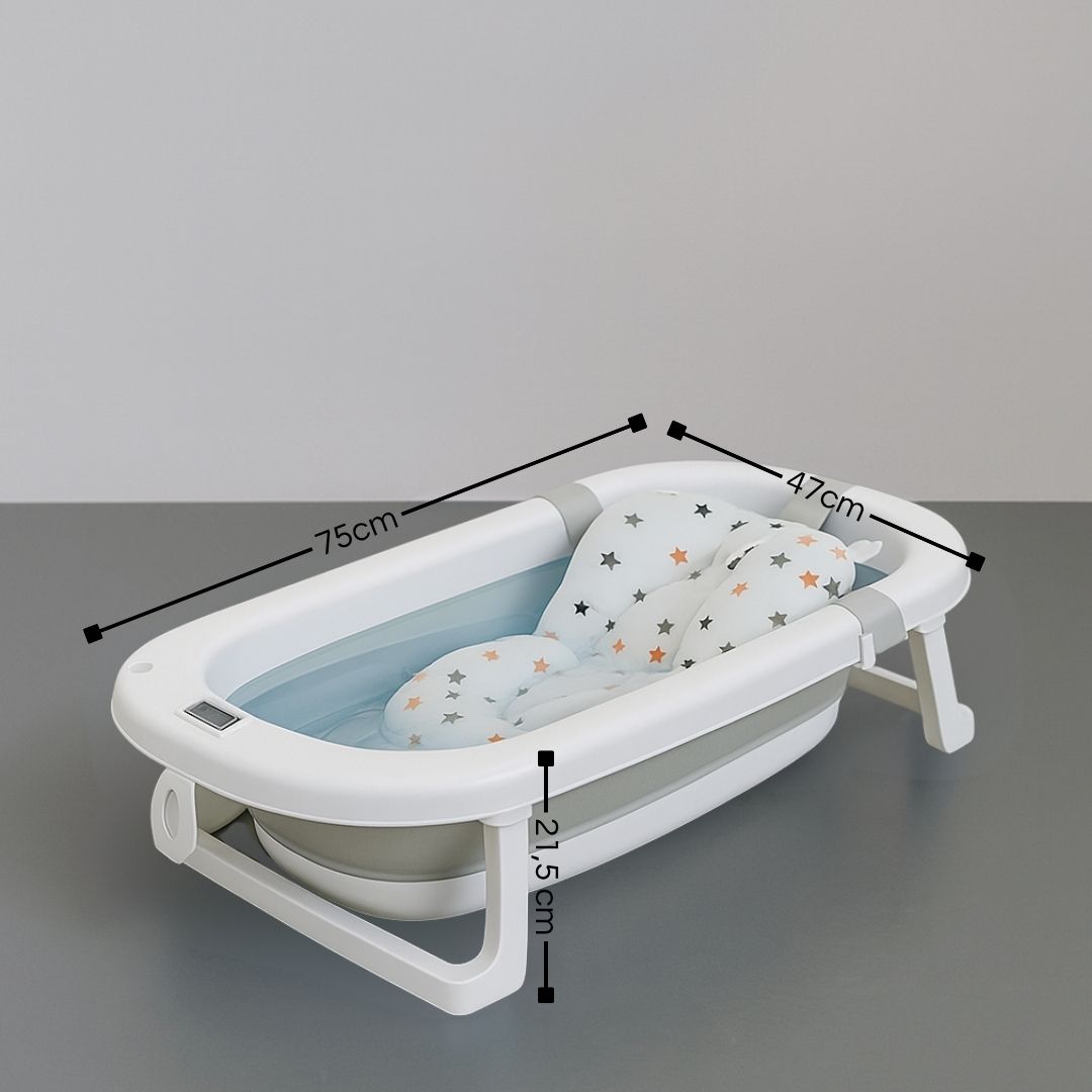 Bañera para bebé plegable ESSENCE con termómetro integrado y cojín reductor de protección antideslizante, con detalles de color gris. Su diseño simple y compacto es muy manejable para poder llevar de viaje y guardar cómodamente en el hogar. Es muy fácil de montar y desmontar y es perfecta para hogares pequeños. Esta bañera compacta y portátil ofrece un espacio cómodo y seguro  para el baño.