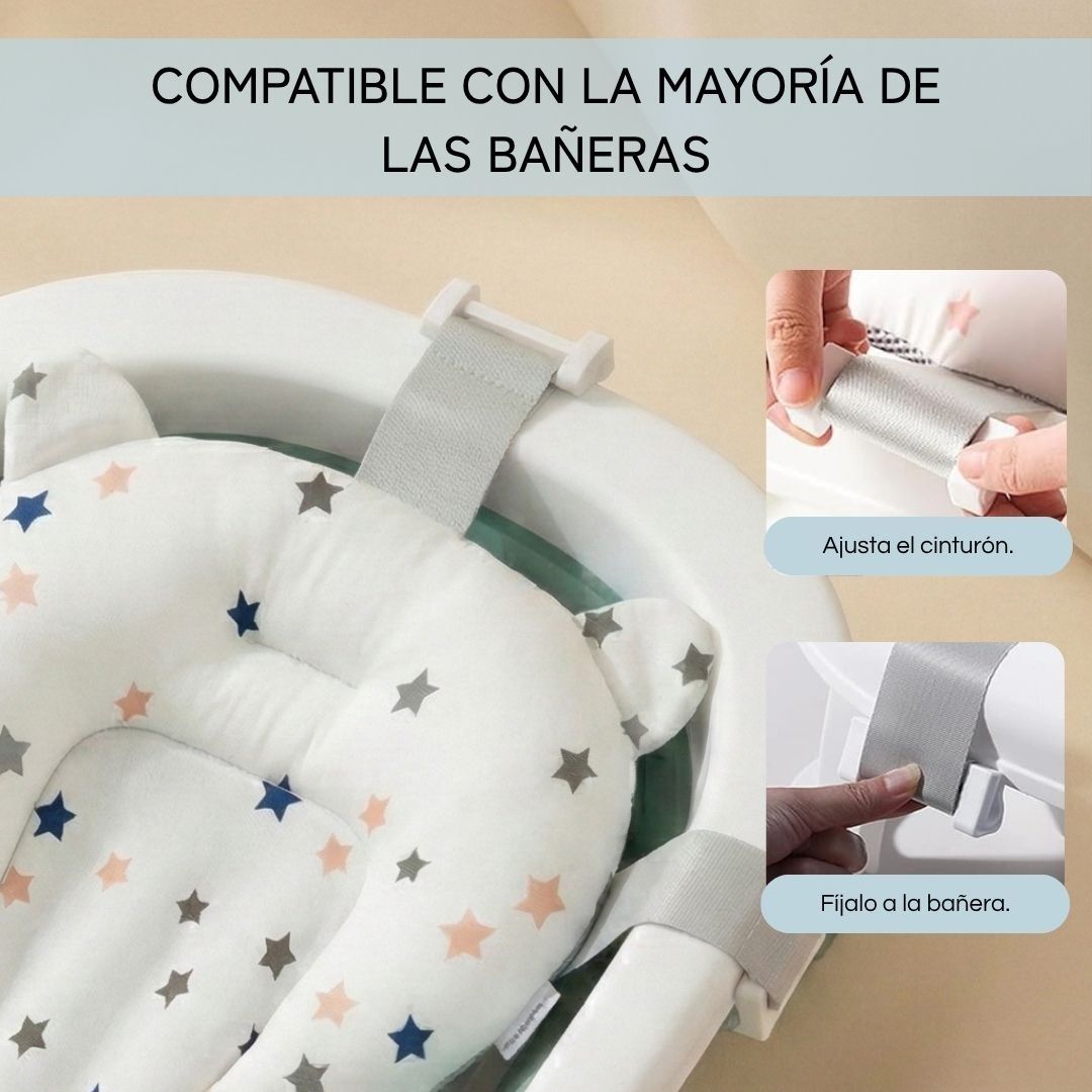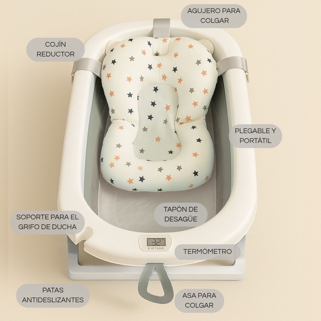 • Cojín reductor de apoyo suave: incluye un cojín ergonómico que proporciona un soporte adicional, asegurando que tu bebé esté cómodo y seguro durante el baño. Este cojín es extraíble para una limpieza fácil y rápida.