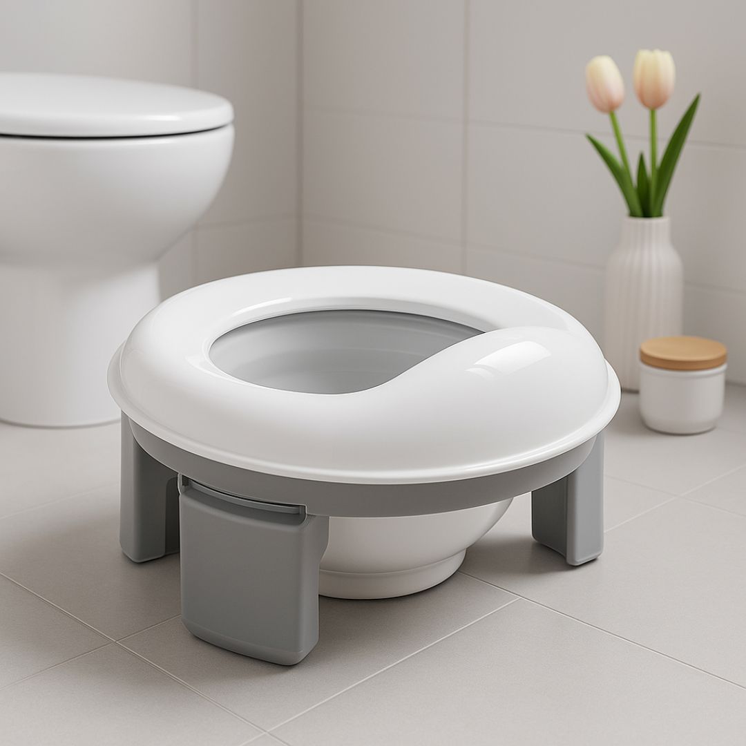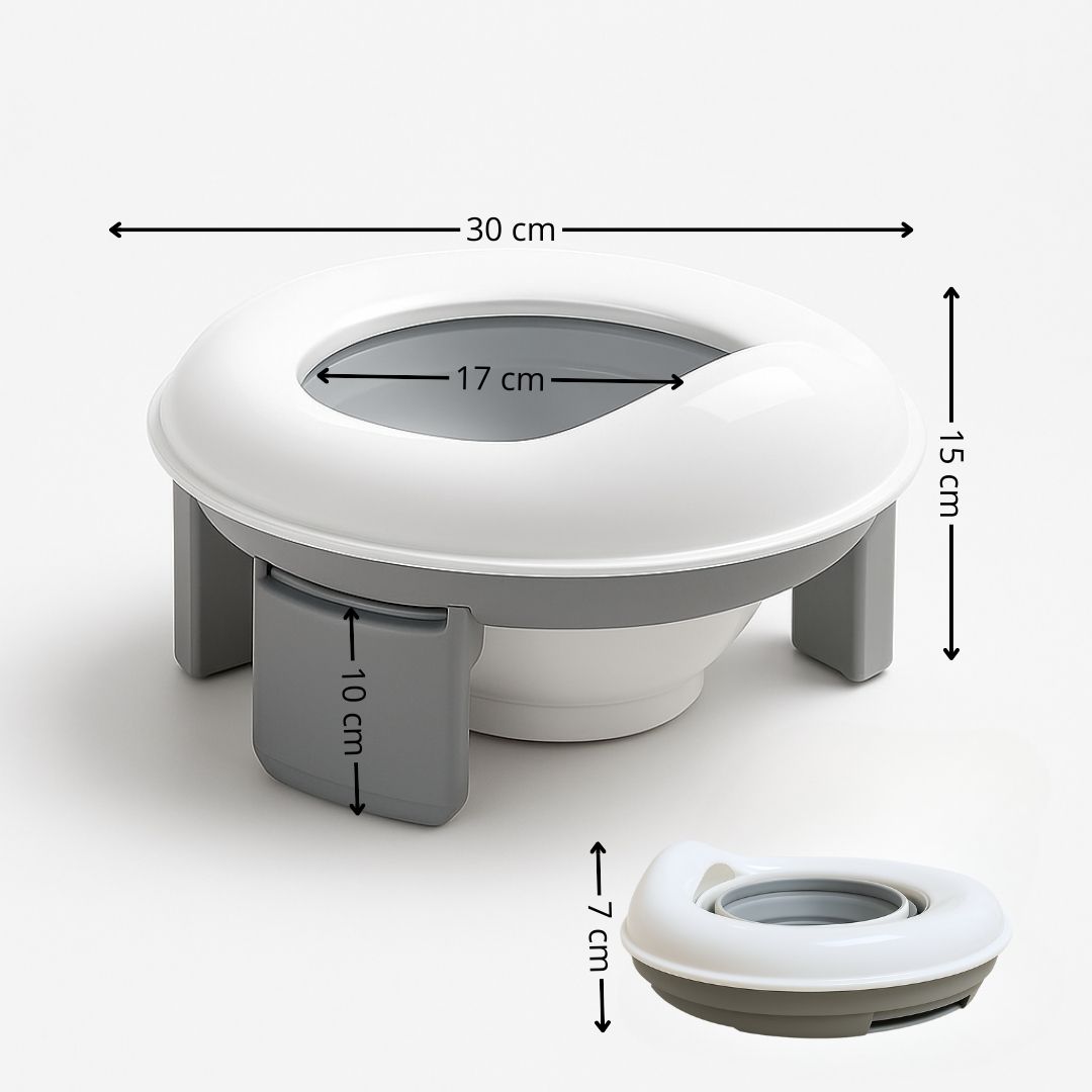 Orinal infantil multifunción plegable, color gris y blanco. Combina asiento reductor, orinal y adaptador de viaje en un solo producto. Fabricado en PP de alta calidad, es seguro, resistente y muy fácil de limpiar, ideal para acompañar a tu pequeño en la etapa de aprendizaje tanto en casa como de viaje.