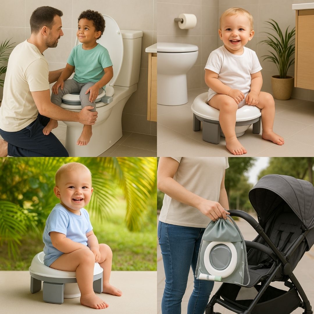 - Multifunción. Nuestro orinal infantil está diseñado para crecer con tu hijo: funciona como orinal portátil, reductor WC y adaptador de viaje. Un accesorio versátil que cubre todas las necesidades de la etapa de aprendizaje.