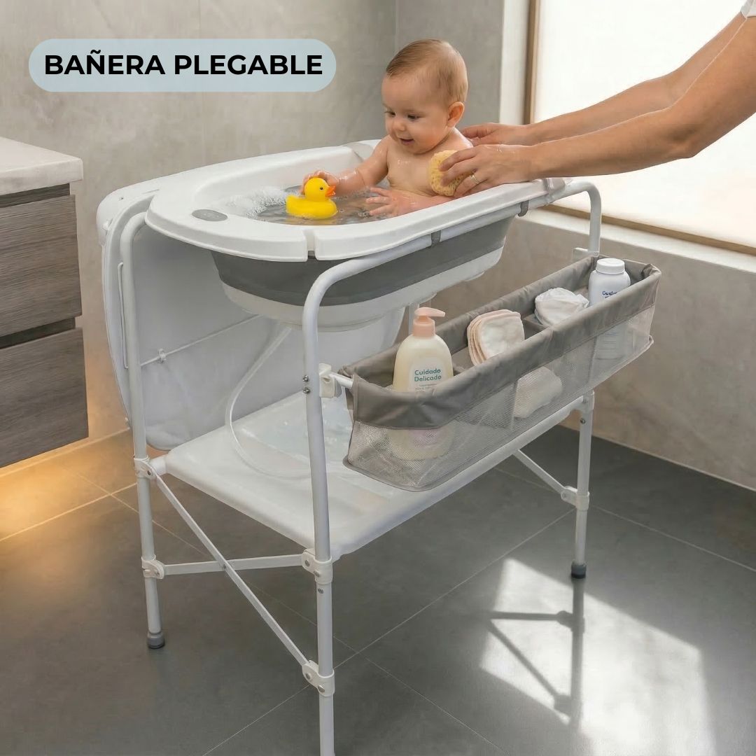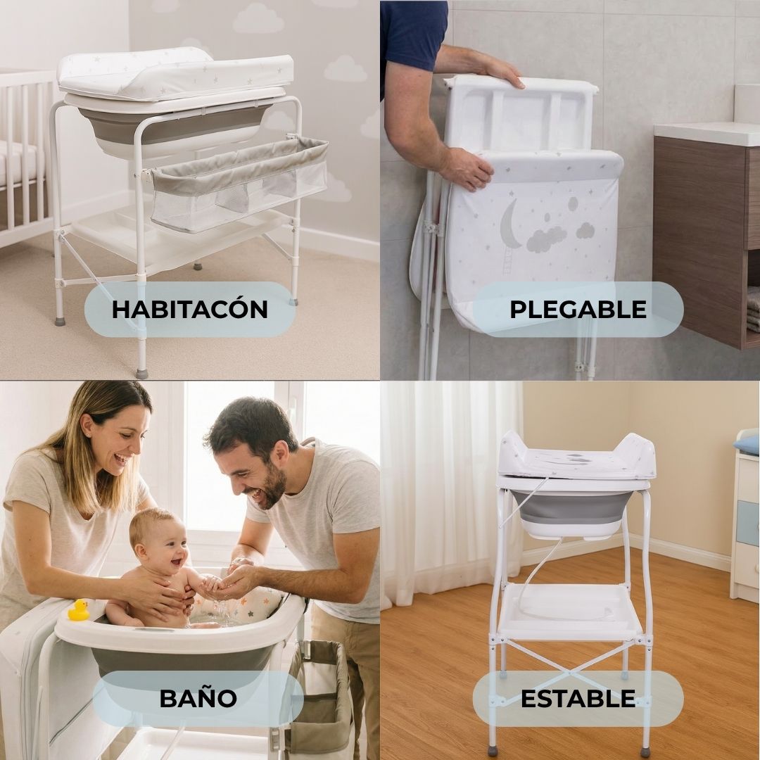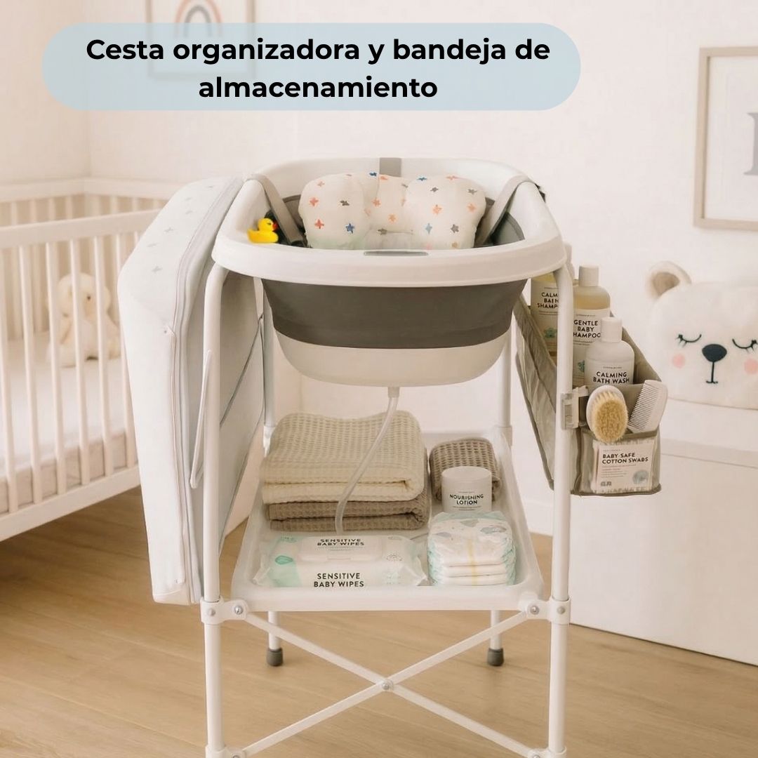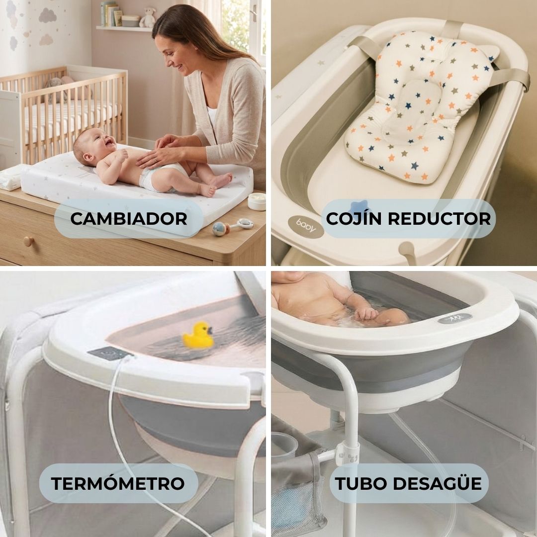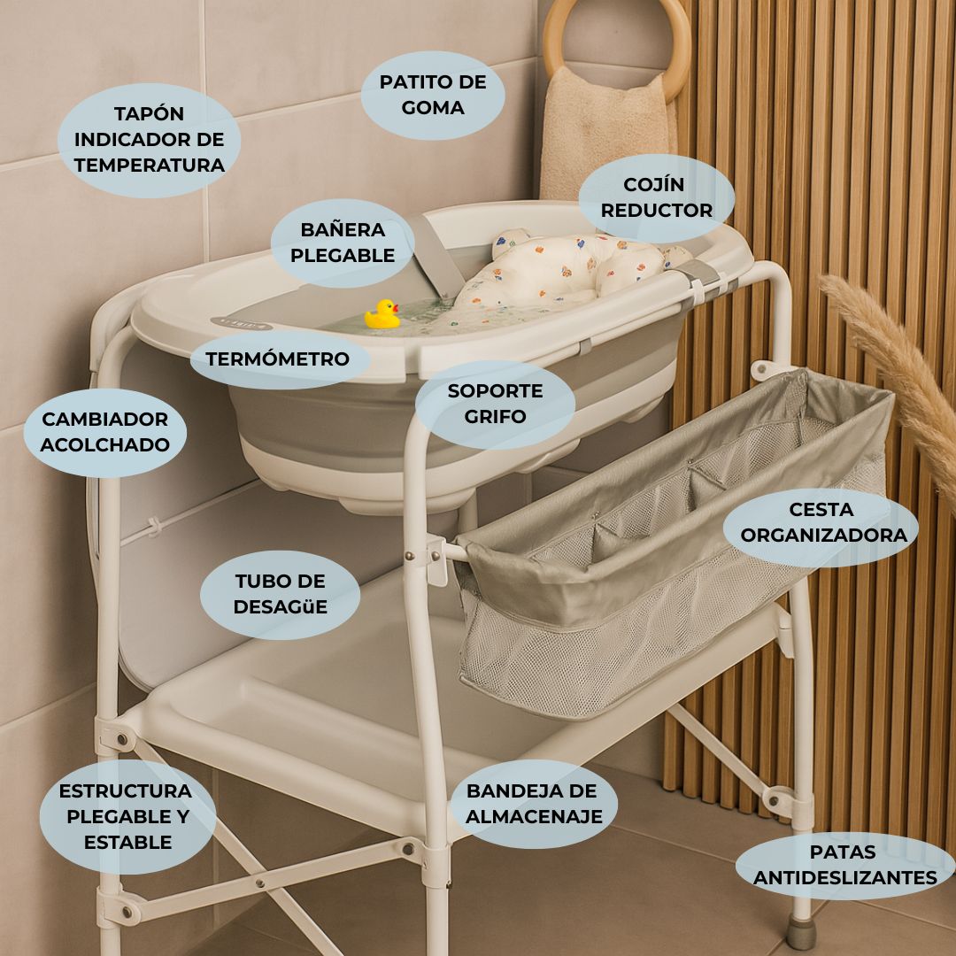 • Cambiador acolchado y ergonómico: su cambiador suave y cómodo permite secar y vestir al bebé directamente tras el baño, evitando movimientos innecesarios y garantizando confort en cada uso.