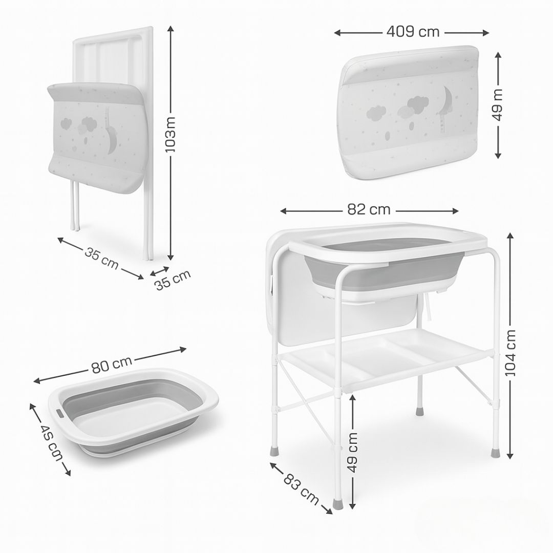 Bañera bebé plegable CLOUD con soporte + termómetro + cambiador + cesta almacenaje + cojín reductor, color Blanco y Gris